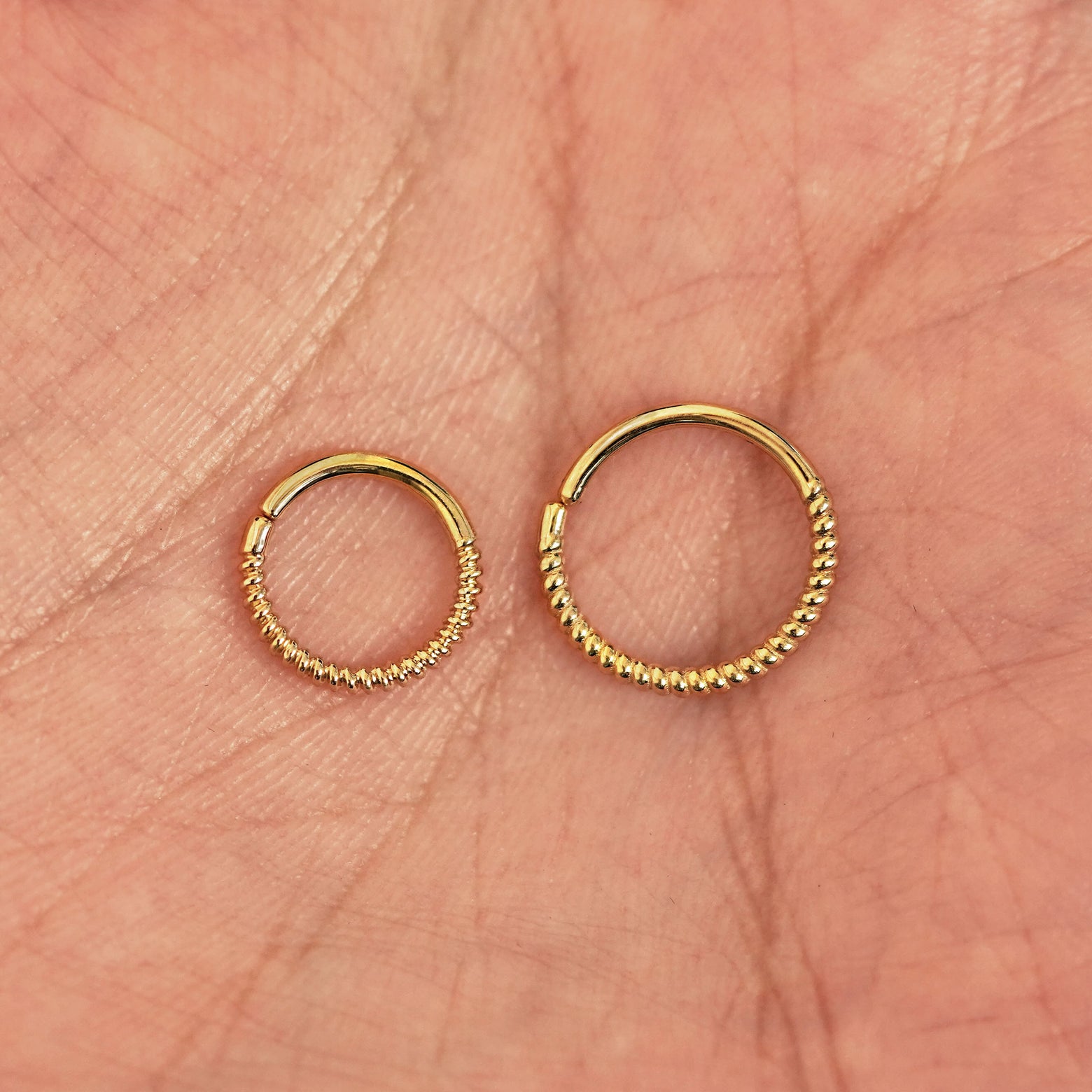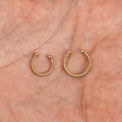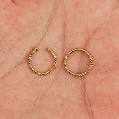 Two 14k solid gold Rope Septum rings show in options of Non-Pierced and Pierced resting in the palm of a model's hand