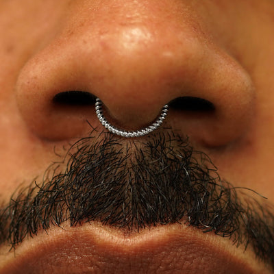 Close up view of a model's nose wearing a 14k white gold Rope Septum