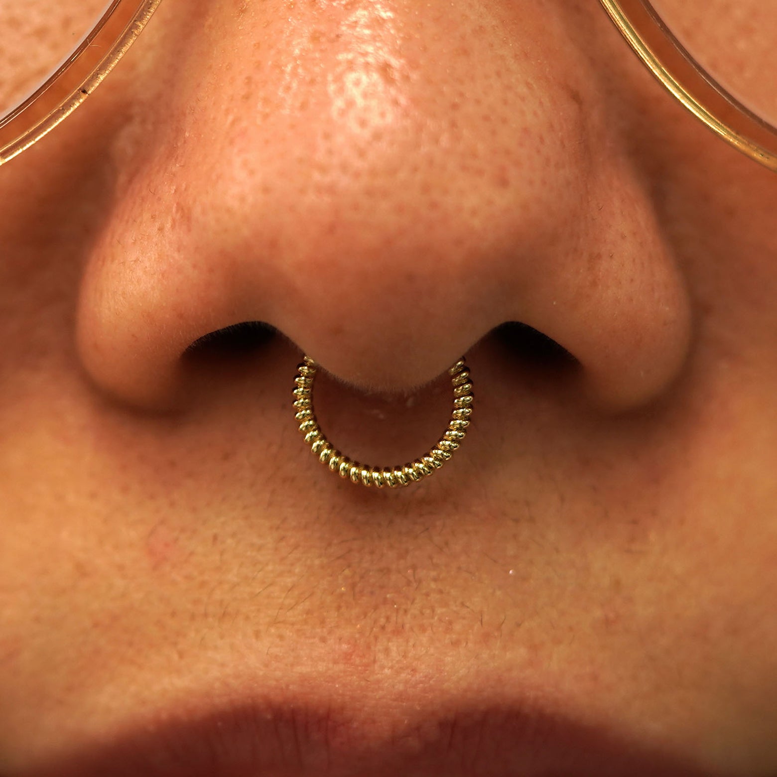 Close up view of a model's nose wearing a 14k champagne gold Rope Septum