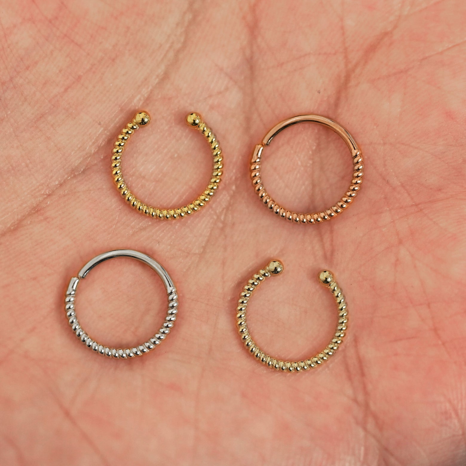 Four versions of the Rope Septum shown in options of yellow, white, rose and champagne gold in a model's palm