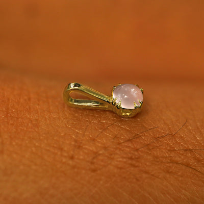 A solid gold Rose Quartz Charm for earring facedown on a model's fingertip to show the solid back of the charm