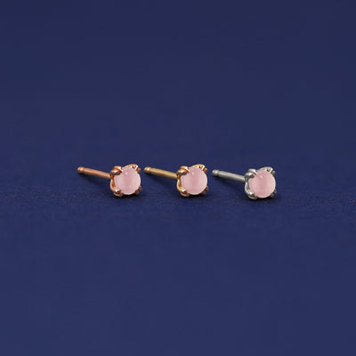 Close up view of a model's ear wearing a 14k white gold Rose Quartz Earring
