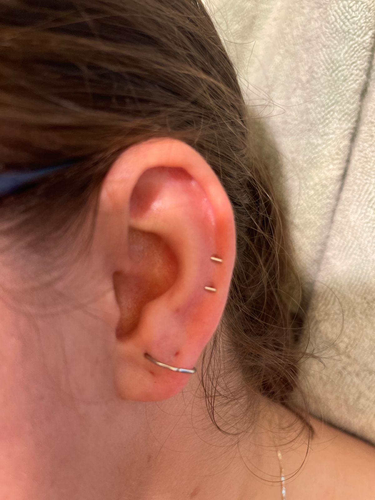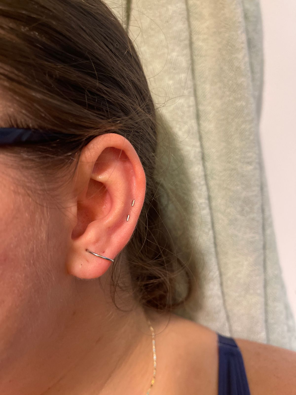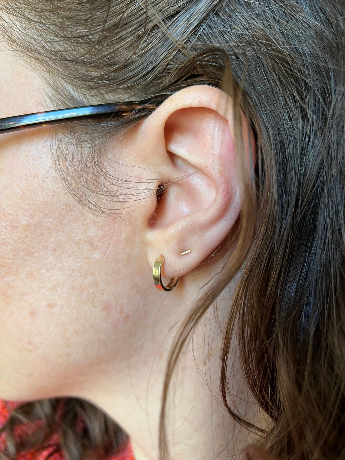 Close up view of a model's ear wearing a 14k gold Small Line Earring
