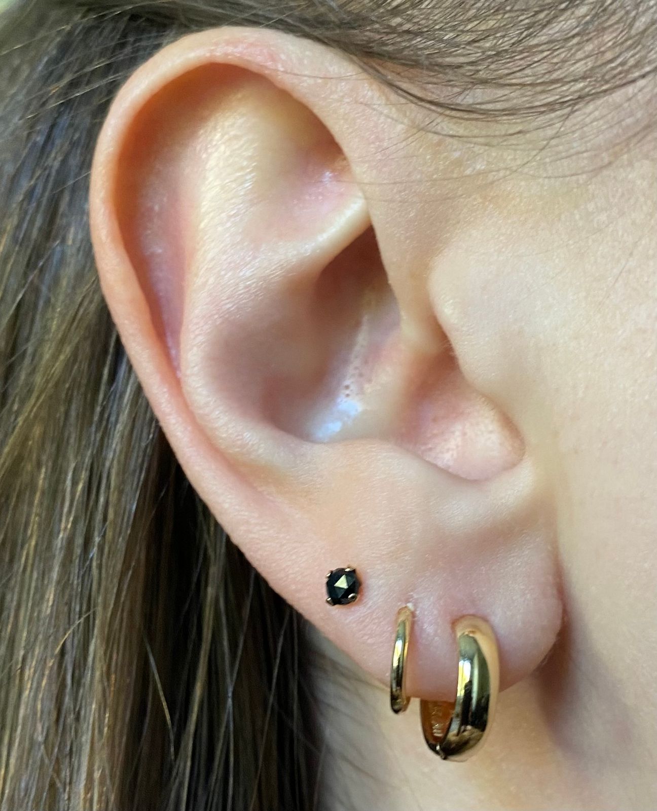 These hoops are gorgeous and so well made. They feel very sturdy and are a bright dash of gold on the ear. I have one in a lobe piercing and one in a cartilage piercing and they are comfy to sleep in as well.