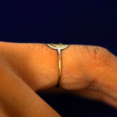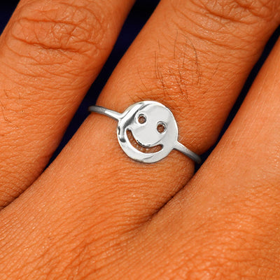 A model holding a Smiley Face Ring tilted to show the side of the ring