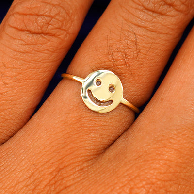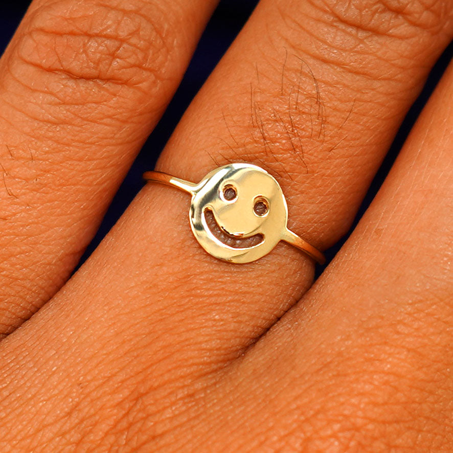Close up view of a model's fingers wearing a 14k champagne gold Smiley Face Ring