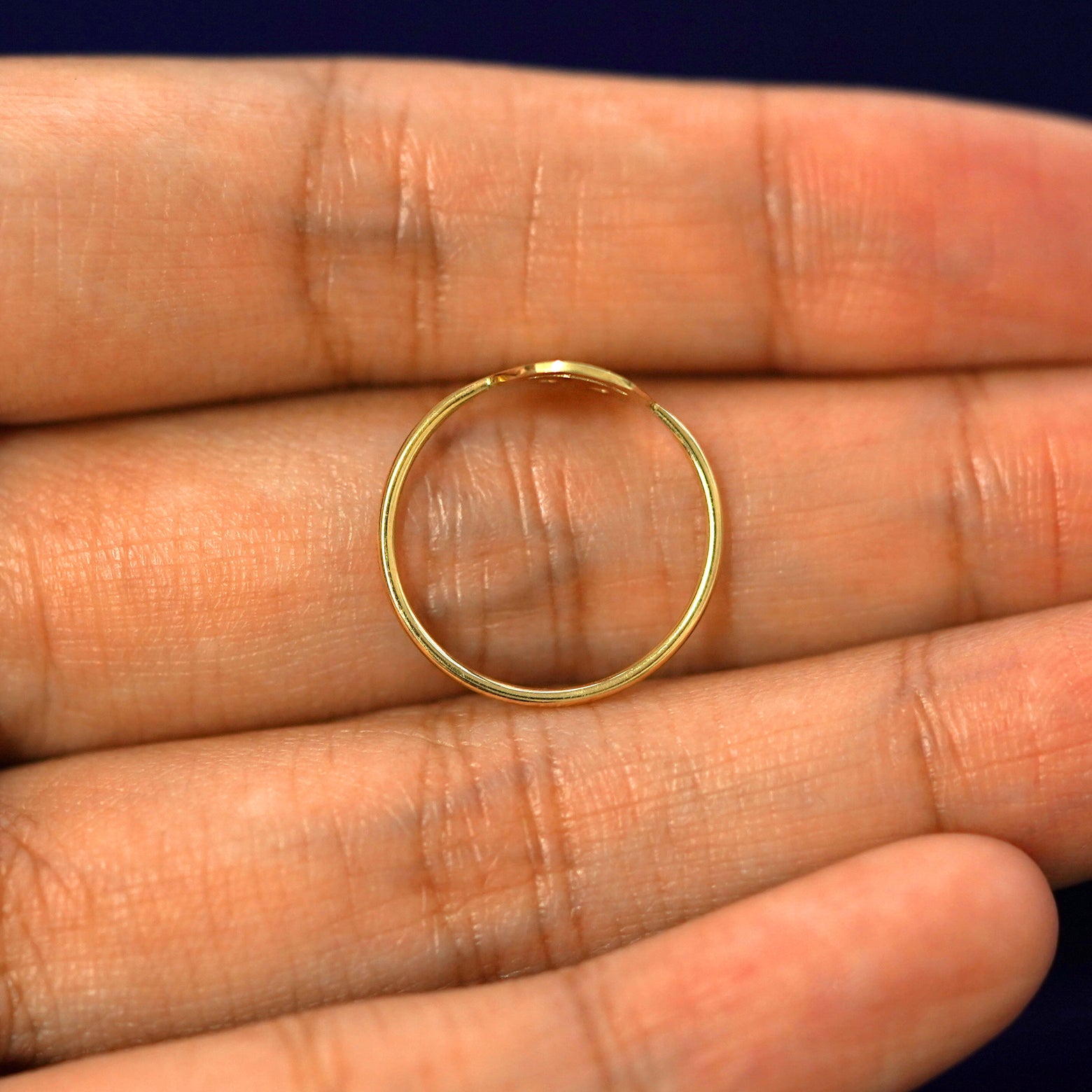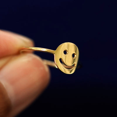 A yellow gold Smiley Face Ring in a model's hand showing the thickness of the band