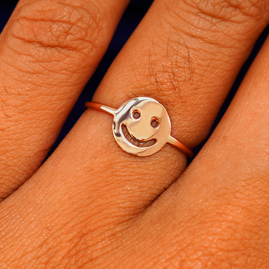 Close up view of a model's fingers wearing a 14k rose gold Smiley Face Ring