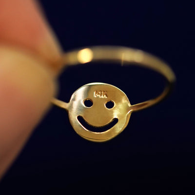 Close up view of a model's fingers wearing a 14k yellow gold Smiley Face Ring