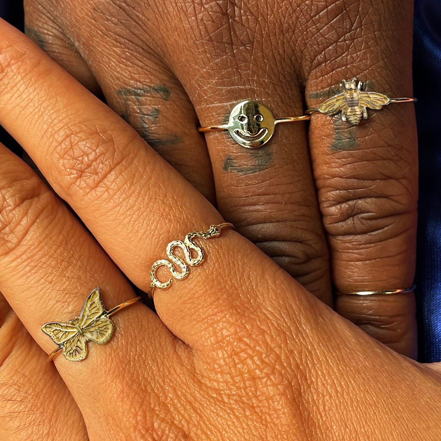 We designed the Smiley Face due to the COVID-19 pandemic, which pushed back many future plans for Automic Gold. And so, this perfectly passive-aggressive little ring was born. Put a smile on wherever you go with our little happy face ring that looks great alone or stacked with our other 14 karat gold rings.