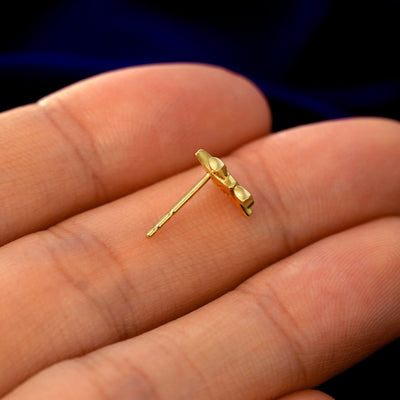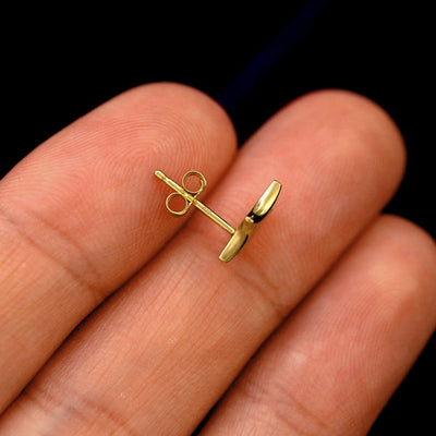 A 14k gold Sparkly Emoji Earring in a model's hand resting on its face to show the back of the stud and the post