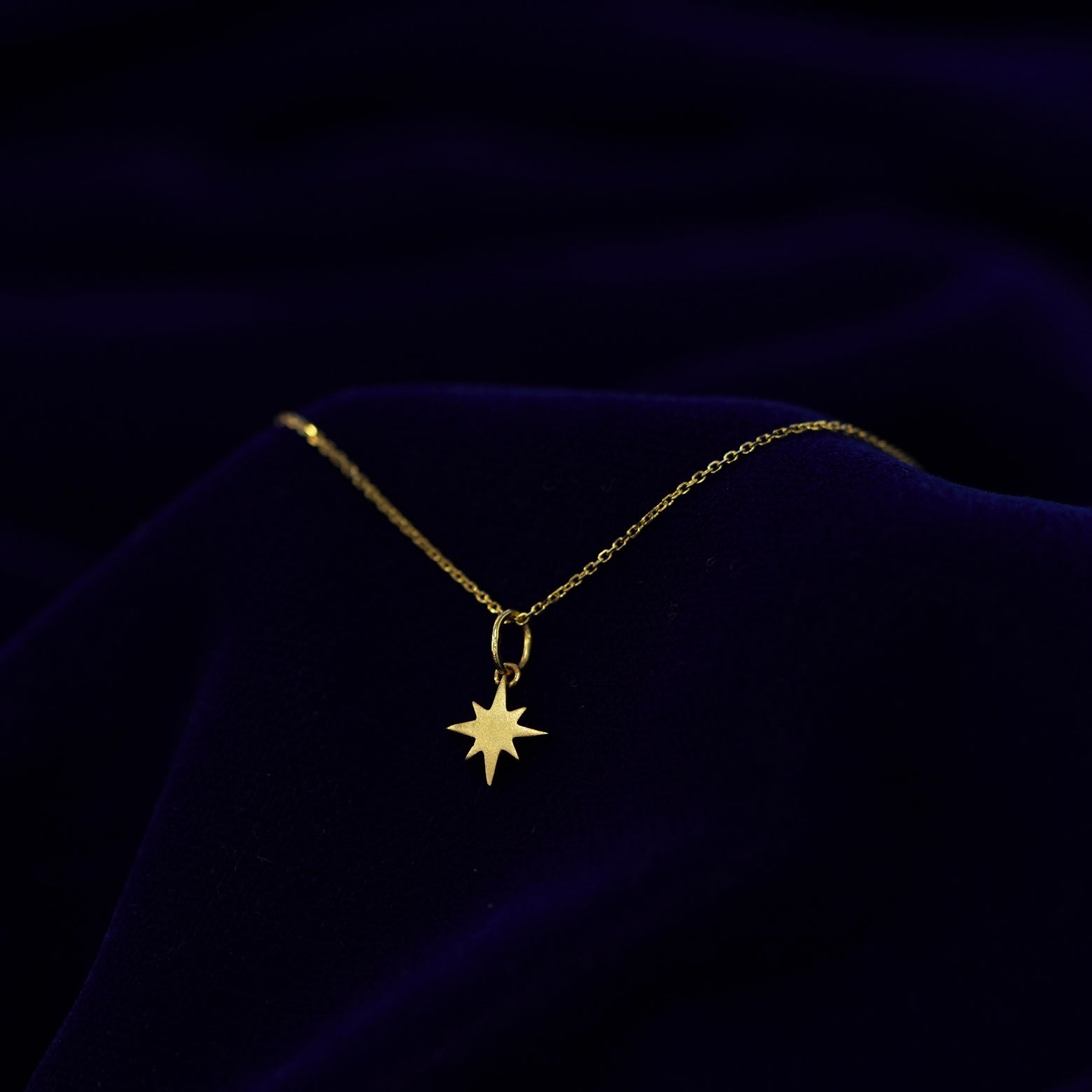 A solid gold Starburst Charm on a Cable Chain displayed on a dark blue cloth