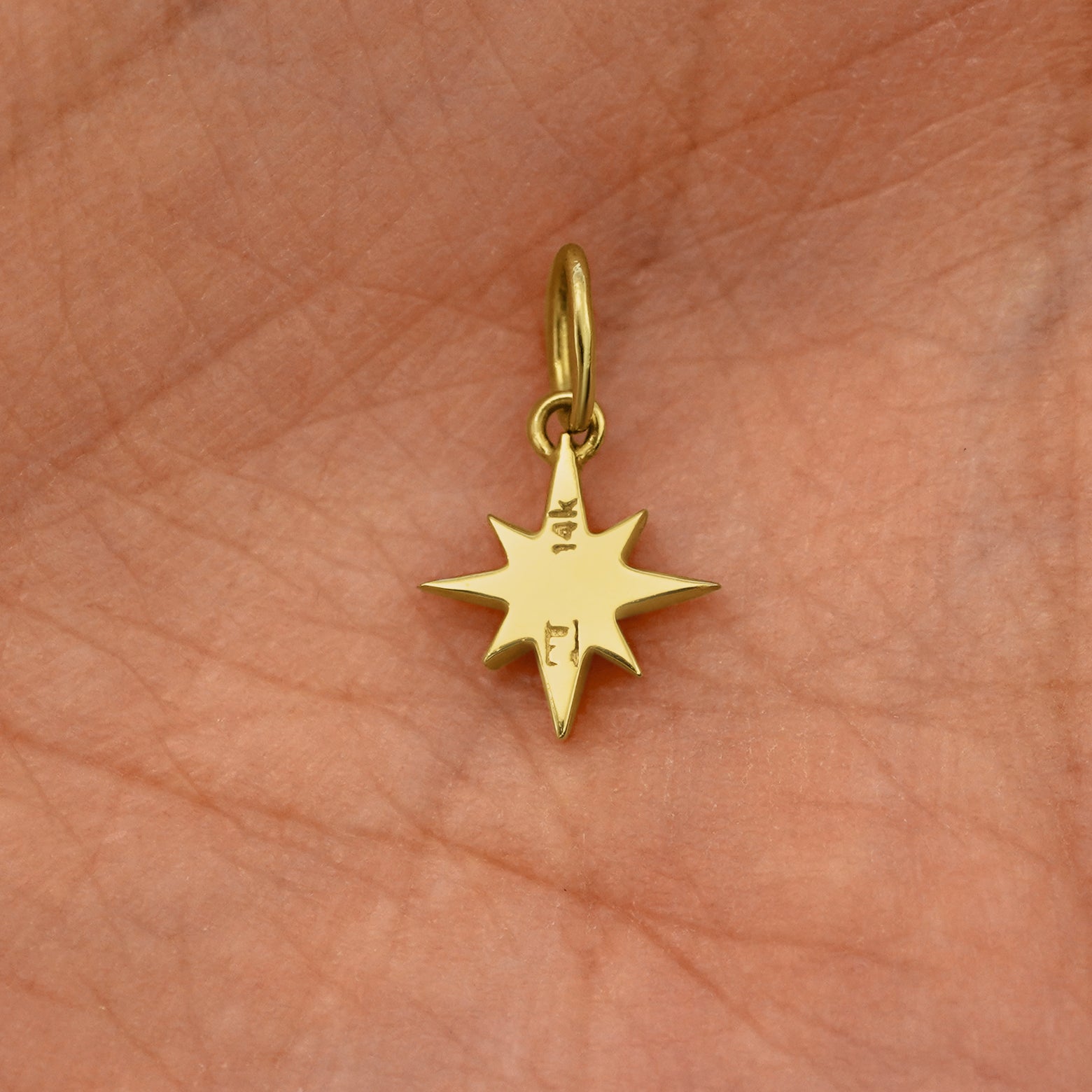 Back view of a solid 14k yellow gold Starburst Charm resting on in the palm of a model's hand