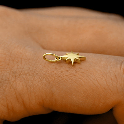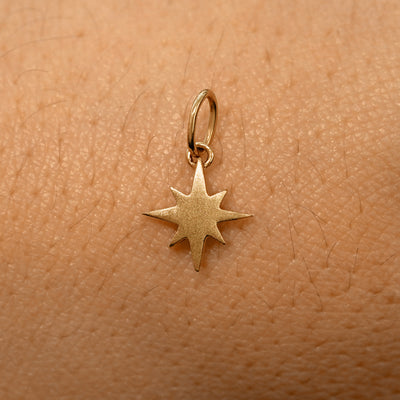 A solid 14k yellow gold Starburst Charm resting on the back of a model's hand