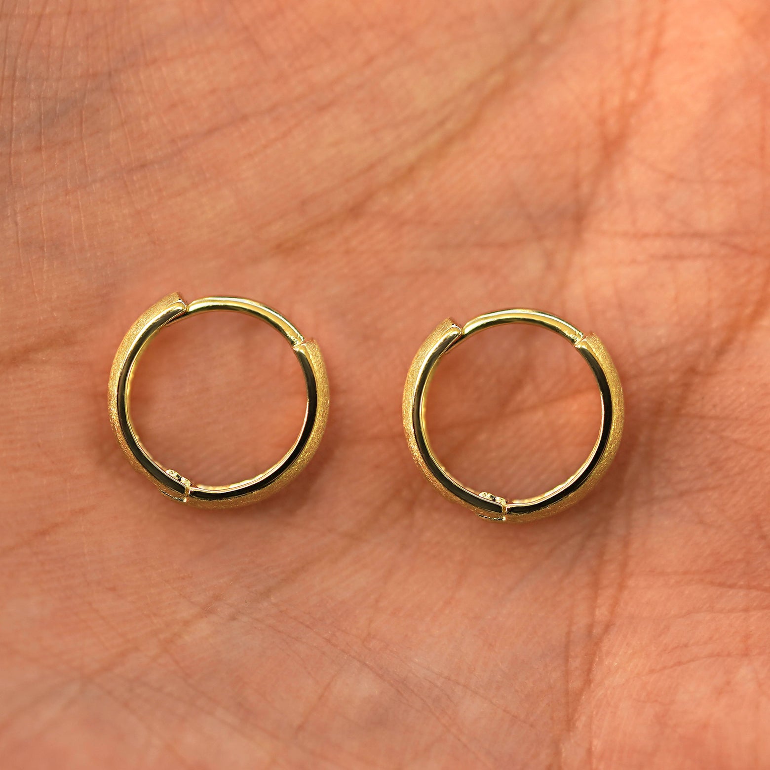 A pair of 14k gold Stardust Small Thick Huggie Hoop Earring sitting in a model's palm