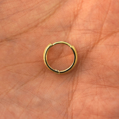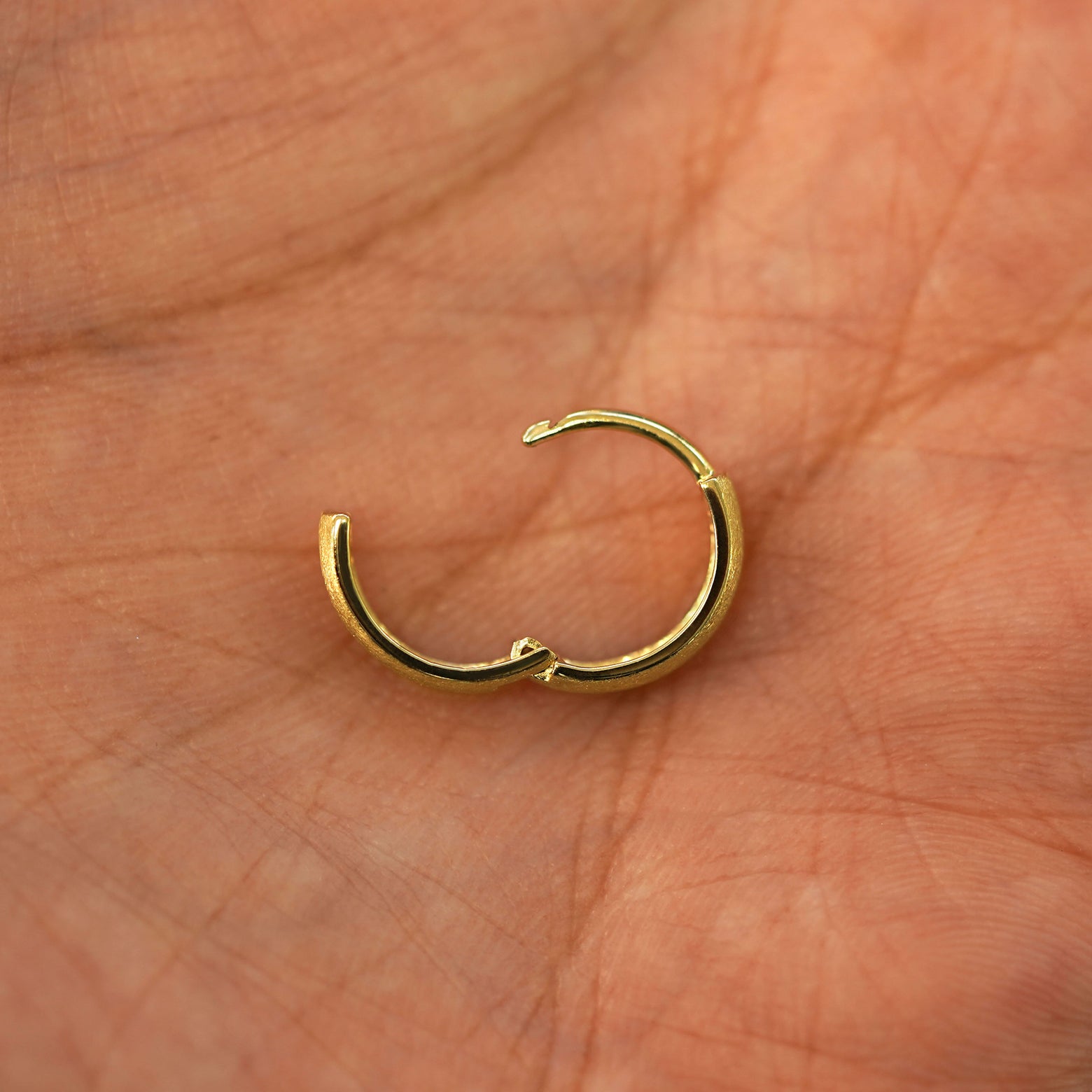 A solid 14k yellow gold Stardust Small Thick Huggie Hoop Earring open in a model's palm to show the hinge
