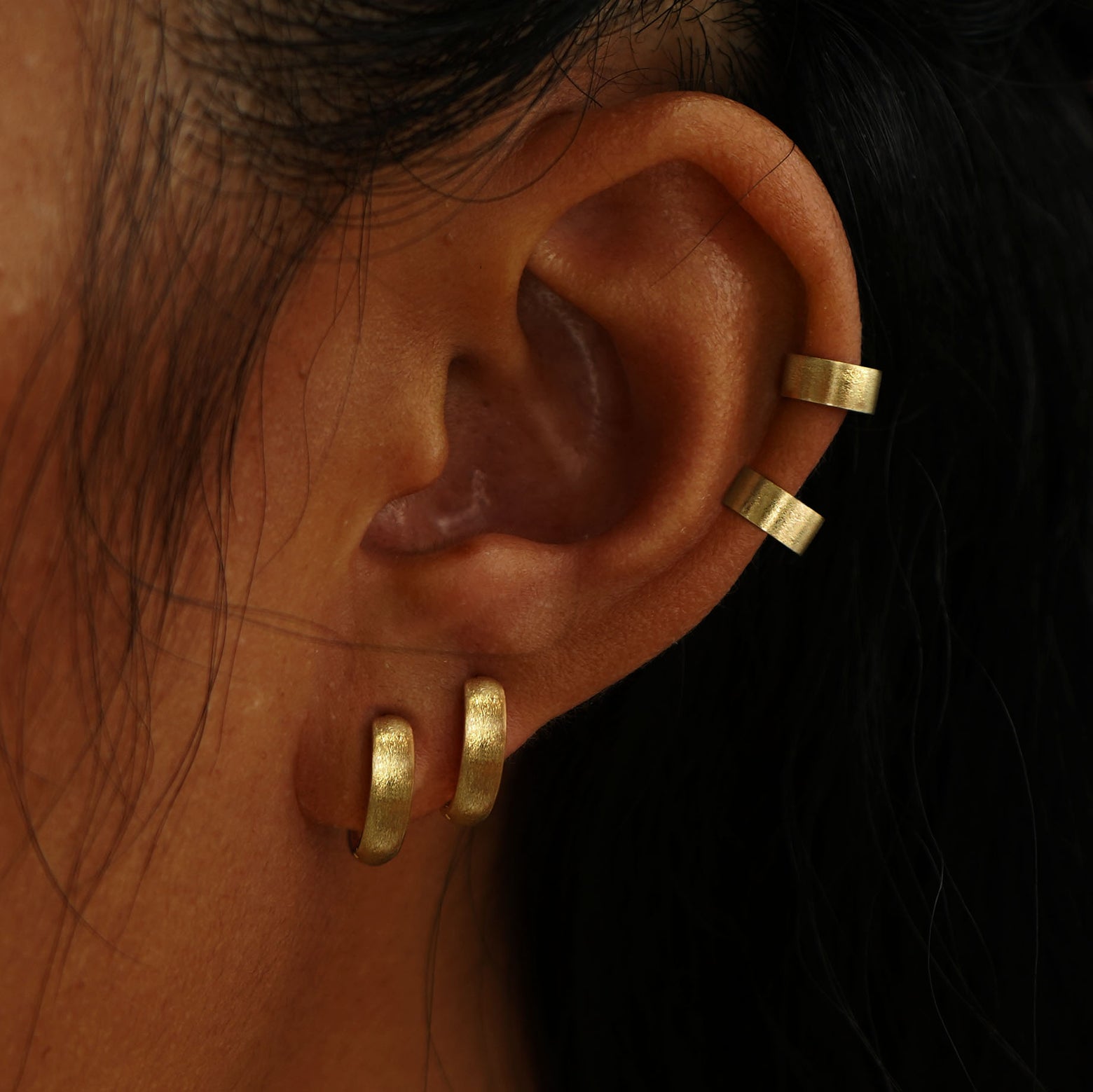 A model's ear wearing two yellow gold Stardust Thick Cuffs and two Stardust Small Wide Huggie Hoops