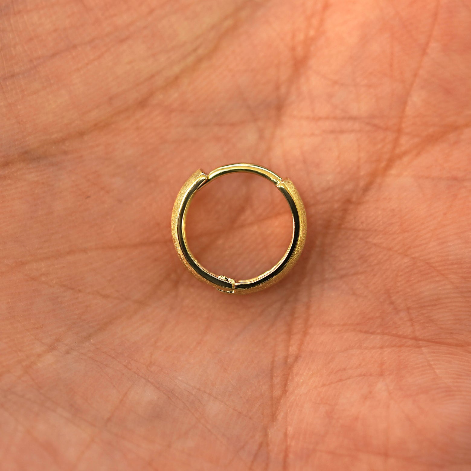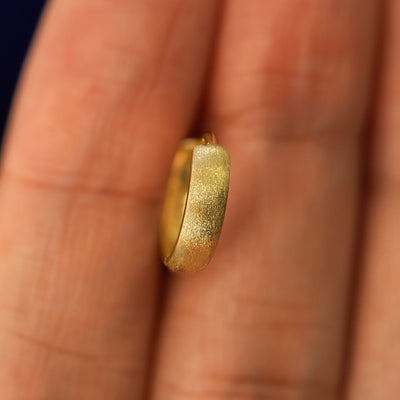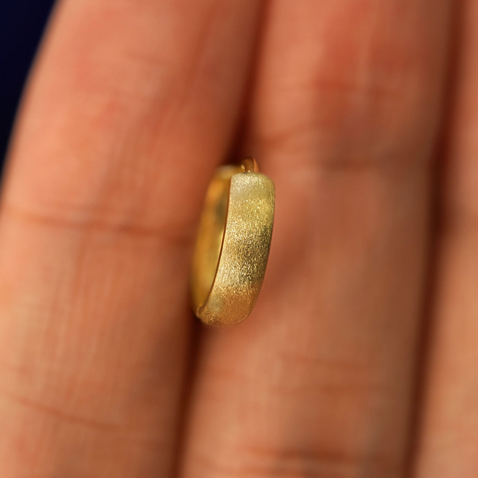 A solid 14k yellow gold Stardust Small Thick Huggie Hoop Earring closed in a model's palm