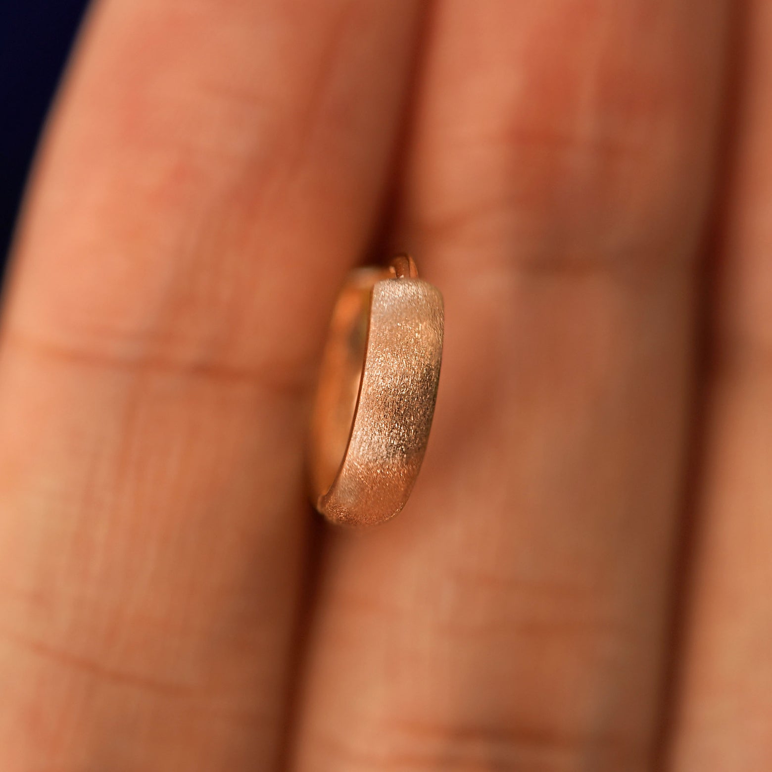 A rose gold Stardust Small Thick Huggie Hoop Earring held in between a model's fingers to show the hoops thickness