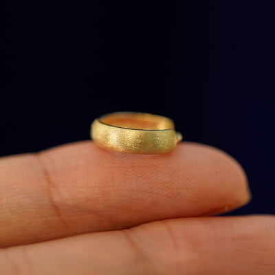 A solid yellow gold Thick Stardust Cuff earring resting on a model's fingertips