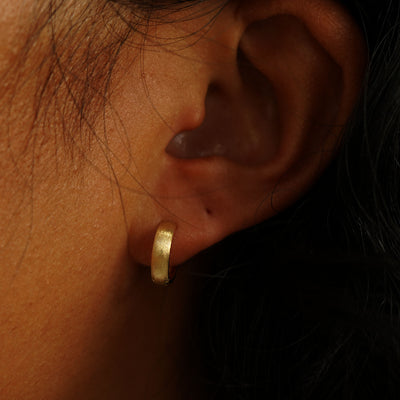 Close up view of a model's ear wearing a 14k gold Stardust Small Wide Huggie Hoops