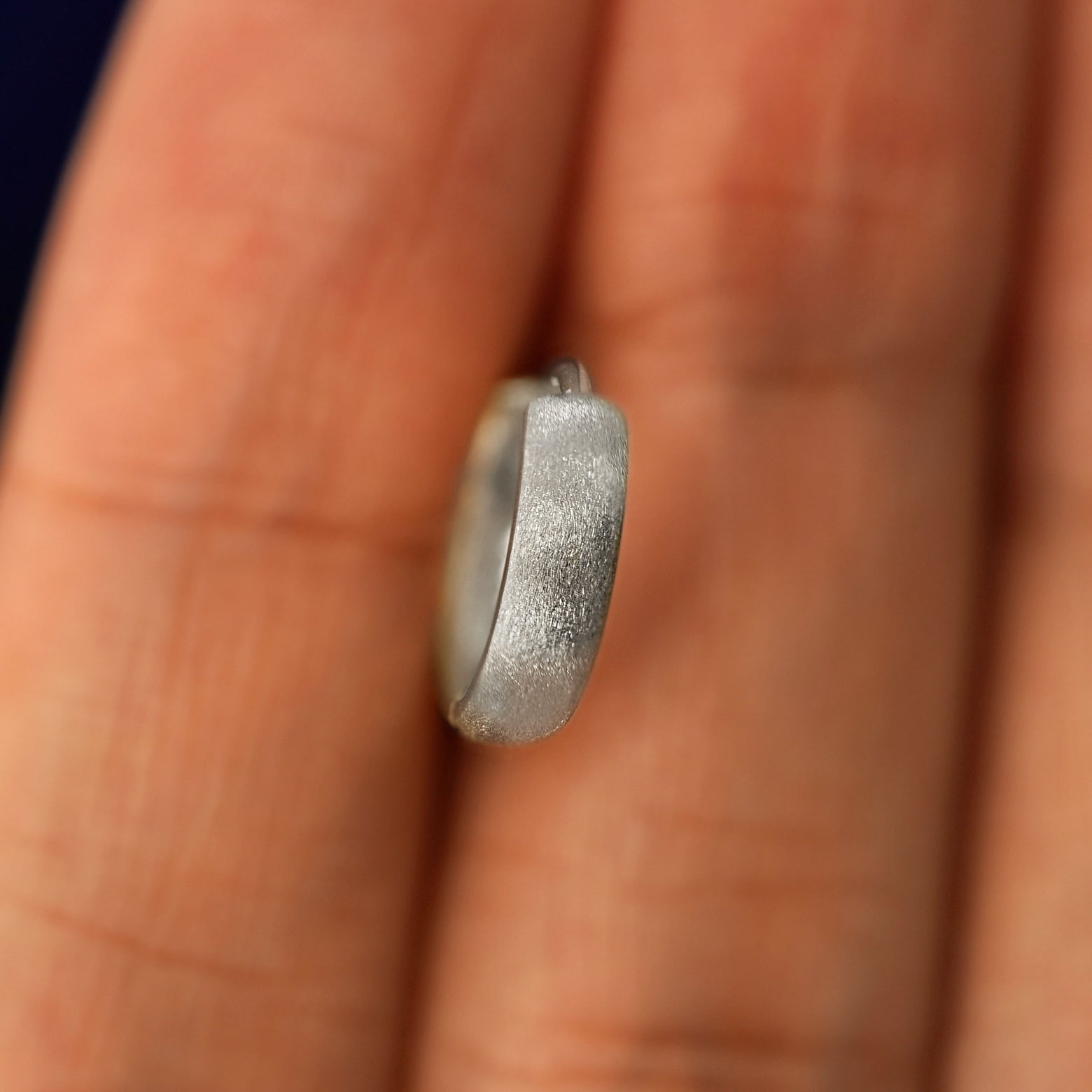A white gold Stardust Small Thick Huggie Hoop Earring held in between a model's fingers to show the hoops thickness
