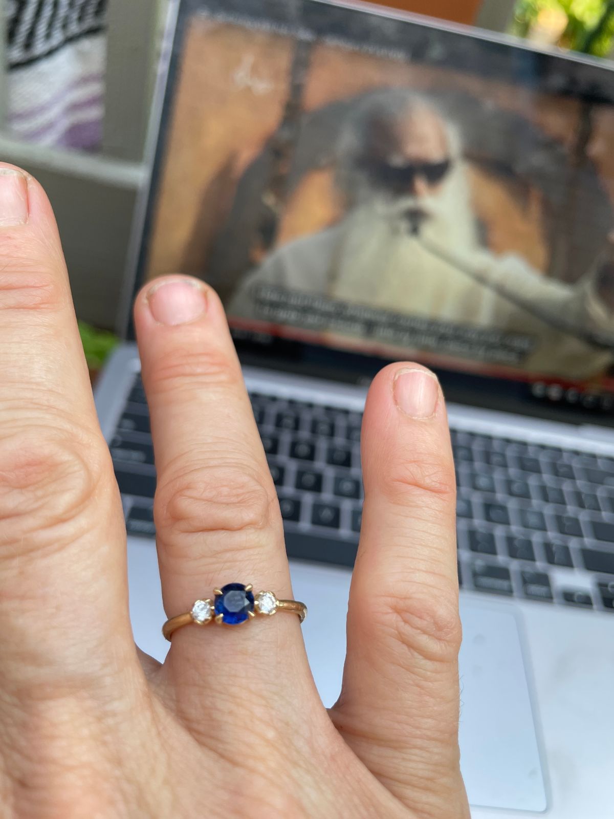 Underside view of a solid 14k gold Three Stone Sapphire Ring