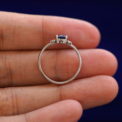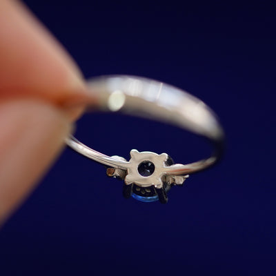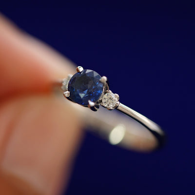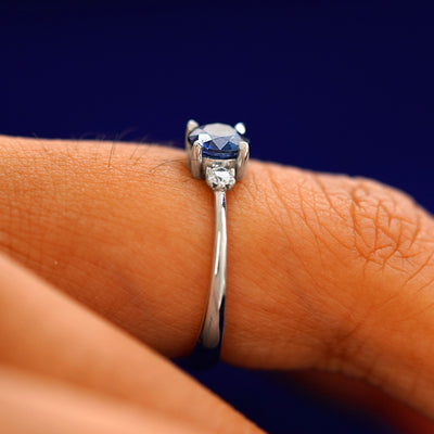 A model holding a Three Stone Sapphire Ring tilted to show the side of the ring