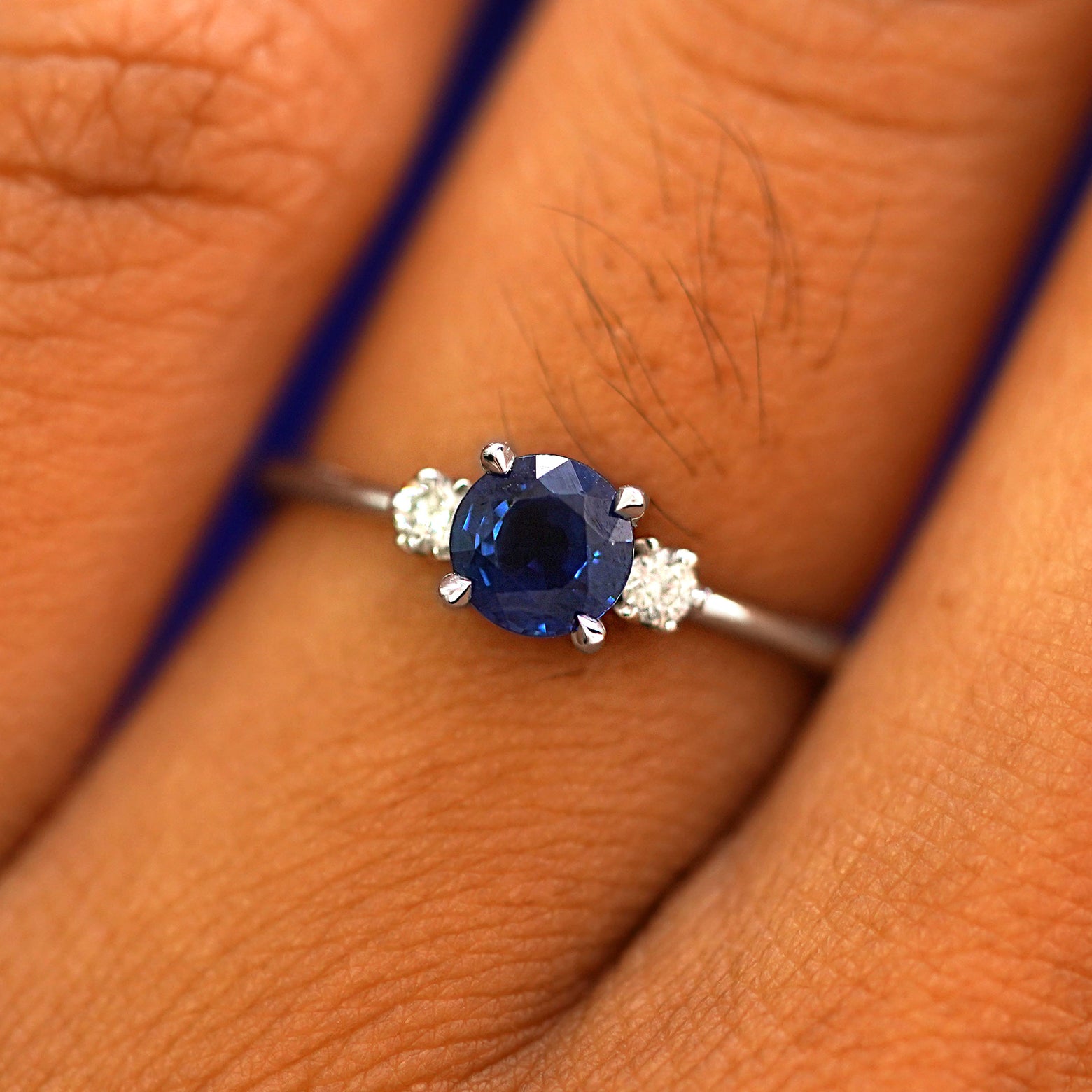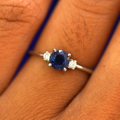 A white gold Three Stone Sapphire Ring in a model's hand showing the thickness of the band