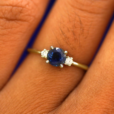 Close up view of a model's hand wearing a 14k champagne gold three stone sapphire ring