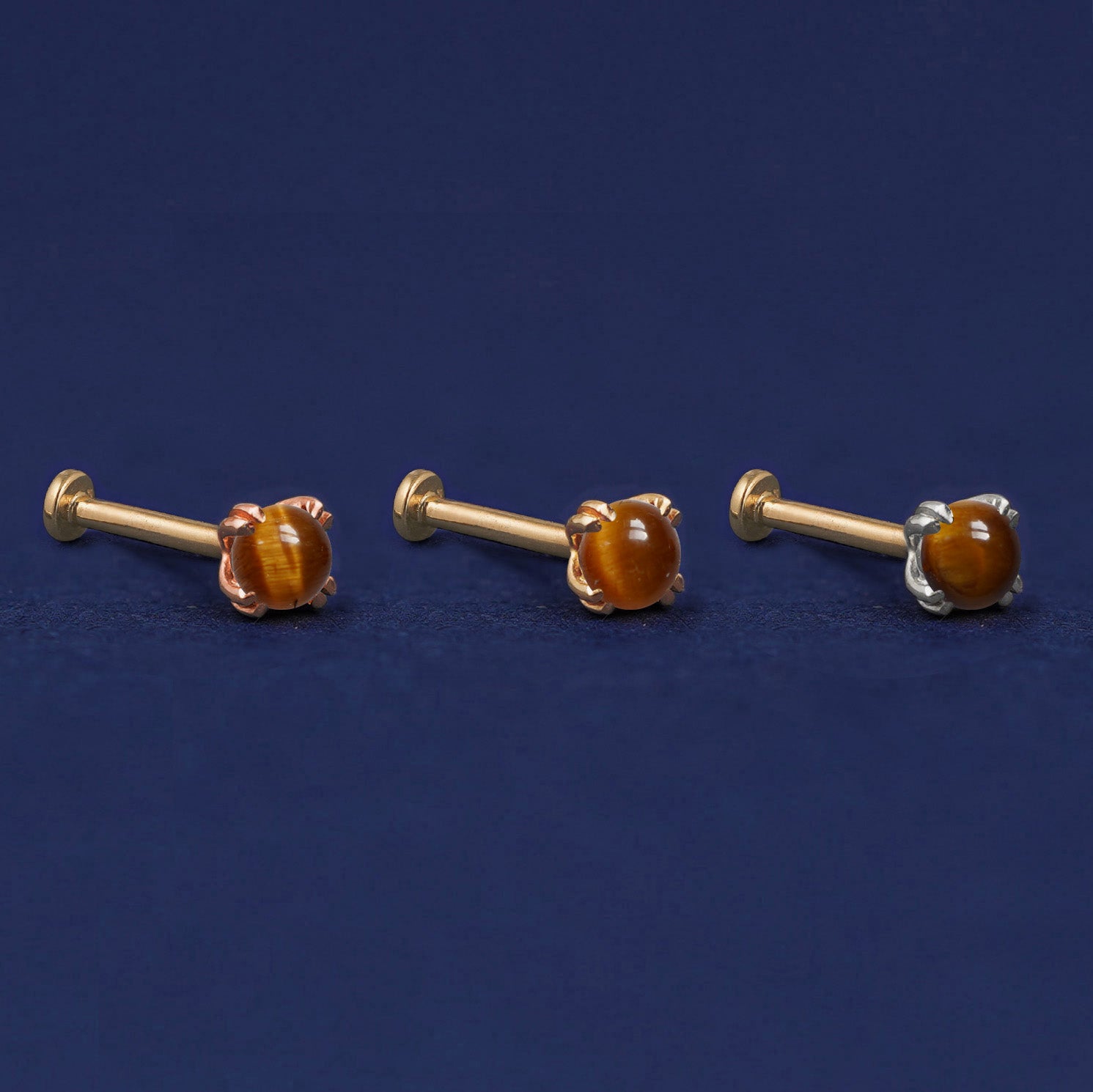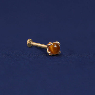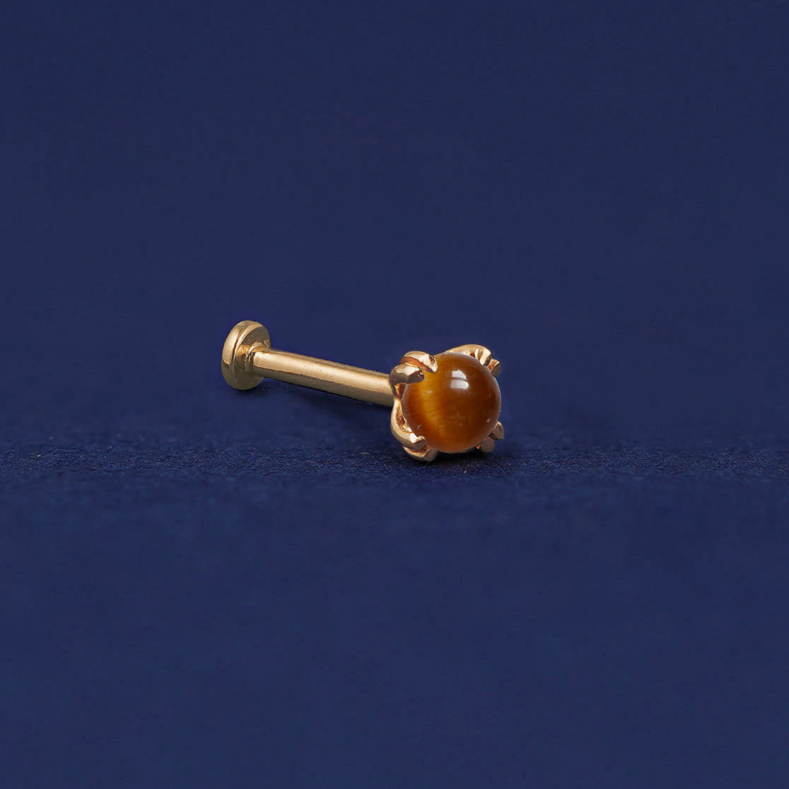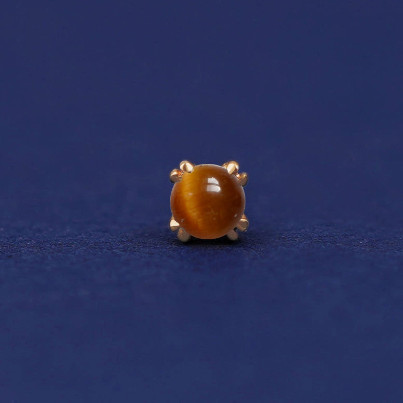 Neutral but bold, the color of this threadless tiger eye stud is the perfect compliment to all your piercings. This cabochon gemsatone flatback piercing is made with recycled solid 14k gold and ethically mined gemstones for a piece that is both beautiful and sustainable.